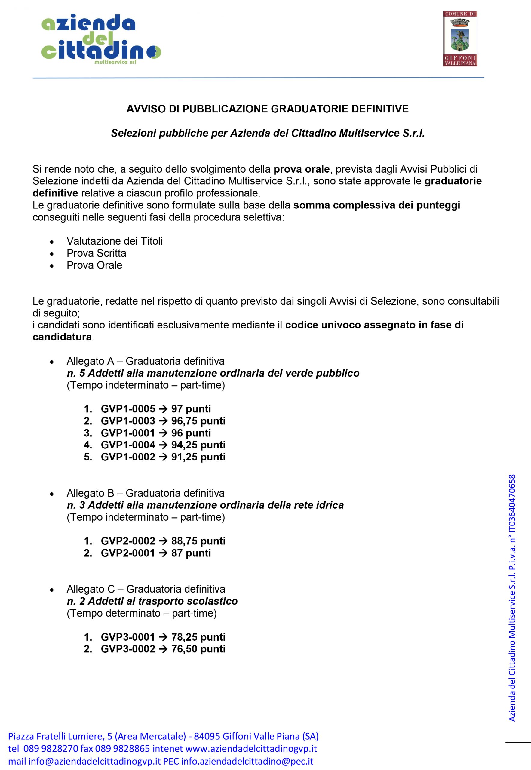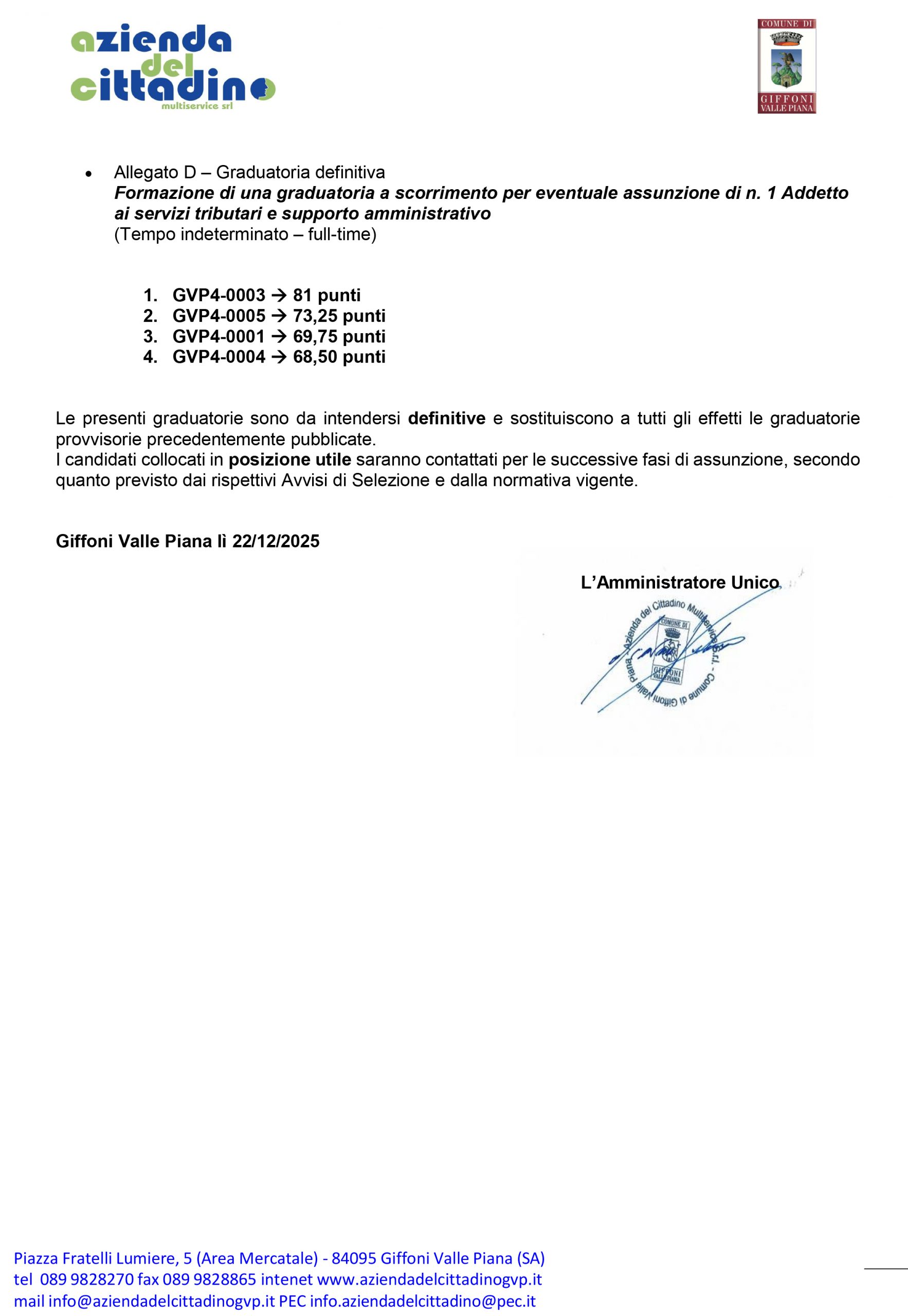 22 Dicembre 2025 Postato da: aziendadelcittadino Categoria: Archivio Bandi, Archivio News, Bandi, News Nessun commento Graduatorie definitive Condividi AziendaPremessa a cura del sindaco Premessa a cura dell’amministratore unico La nostra storia Politica aziendale Organigramma aziendale Fatturazione Elettronica